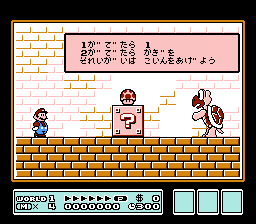 There were going to be two new enemies called Gold Cheep Cheep (a golden version of a Cheep-Cheep), and Green Parabeetles (green colored Parabeetles). The Gold Cheep Cheeps would come in groups and swim faster than regular Cheep-Cheeps and the Green Parabeetle is a green Parabeetle that flies faster than normal ones. The game coding reveals an item-sized Toad icon among some of the game’s suits; this is interpreted by several as a sort of “Toad Suit”, although it makes no changes to gameplay when granted to Mario. This is likely due to it being scrapped early and never given any purpose. Designers also considered a power-up to turn Mario into a Centaur (half-man, half-horse), although this was rejected (Tilden 1990, 21).