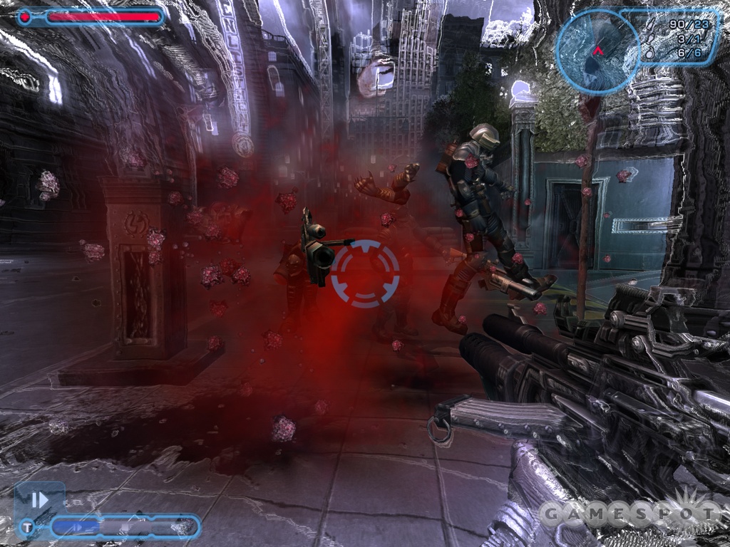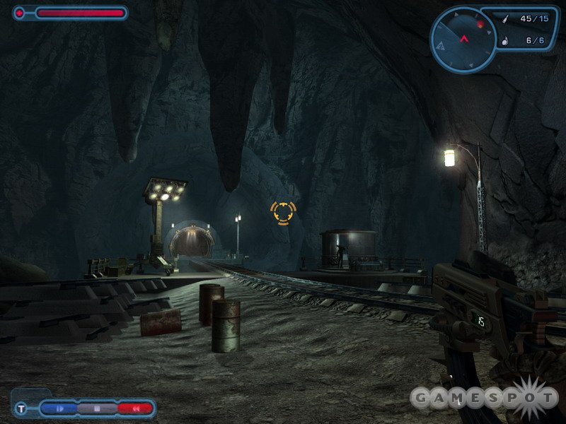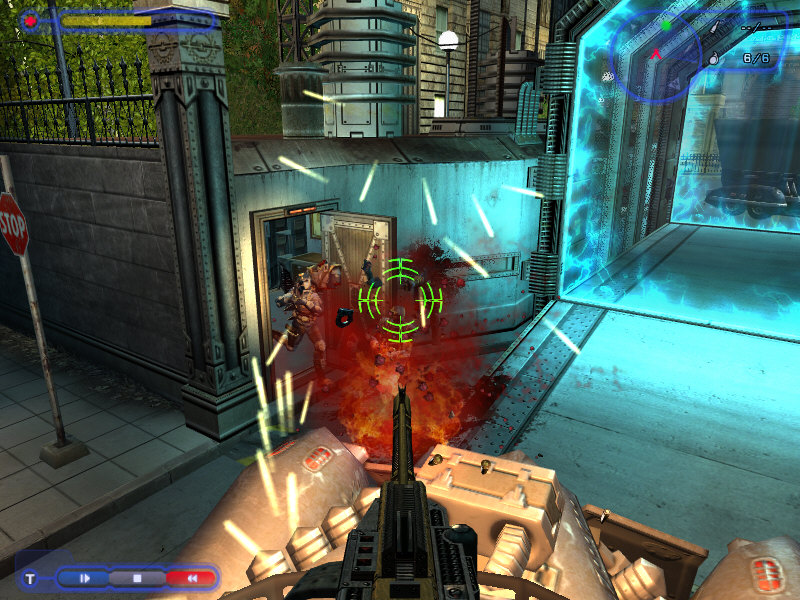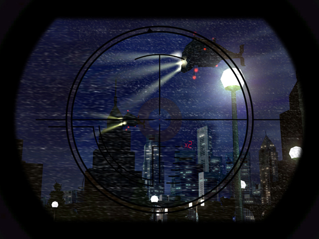 A very small section of one of the game’s levels, in a nighttime setting, was playable at the E3 show. This urban area was cluttered with trash cans, elevators, and alleys. In terms of weapons, there wasn’t much variety. Perhaps because the game was presented in a limited setting, the only weapons that were readily available were a straight machine gun and a short-range rocket launcher. Also, the only real power-up was an ammo recharge. According to a Ripcord representative, however, several new weapons and power-ups will be added to the finished product.